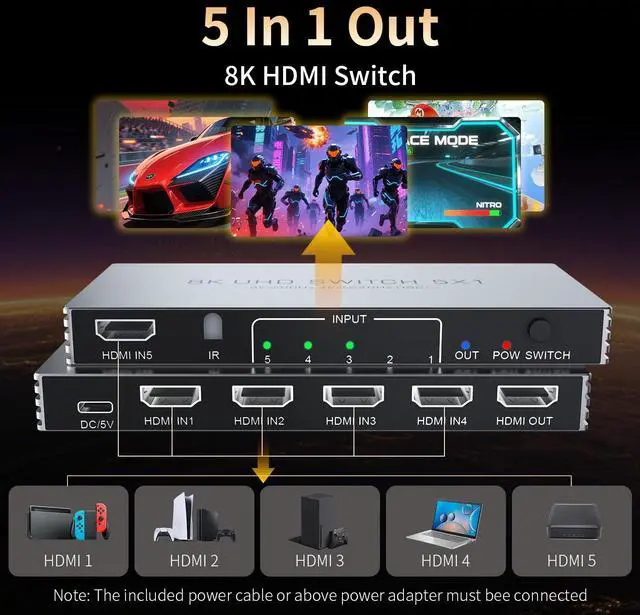 HDMI Switch 5 in 1 Out 8K@60Hz 4K@240Hz HDMI 2.1 Switcher Splitter Support HDR10+ HDCP 2.3 CEC with Power Adapter Compatible with PS5/4 Xbox Nintendo Switch Roku Apple TV Fire Stick