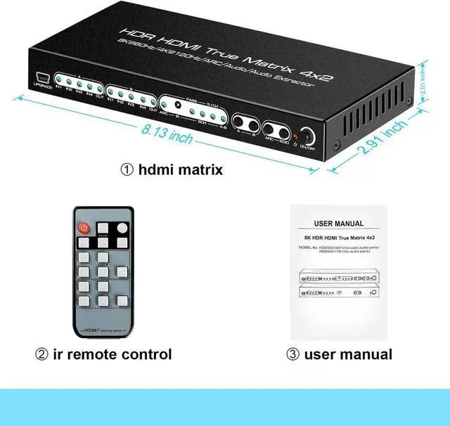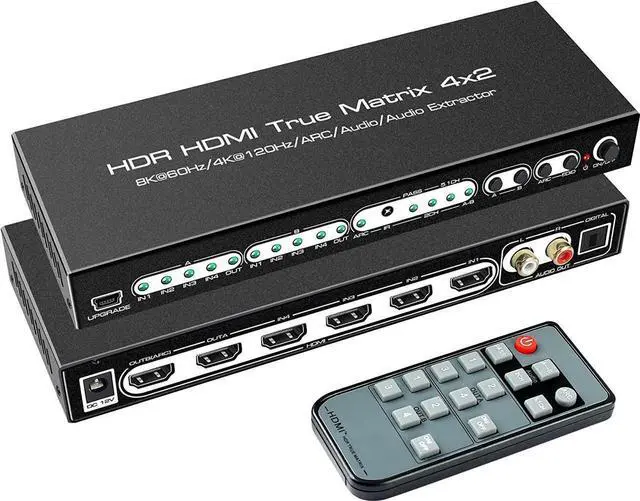 - 4K HDMI Matrix 4x2 distributes four HDMI sources to two HDMI displays reliably, supports HDMI2.1 8K60Hz 4:4:4 8bit 18Gbps, HDR 10, HDR Dolby Vision, firmware upgrade via micro-USB port.