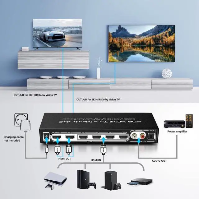Extract audio from HDMI outputs and output to optical audio and L/R audio. HDMI Matrix Switch 4x2 Supports LPCM / Dolby / DTS 5.1 audio. Dolby Atoms HDR 10 Dolby Vision.