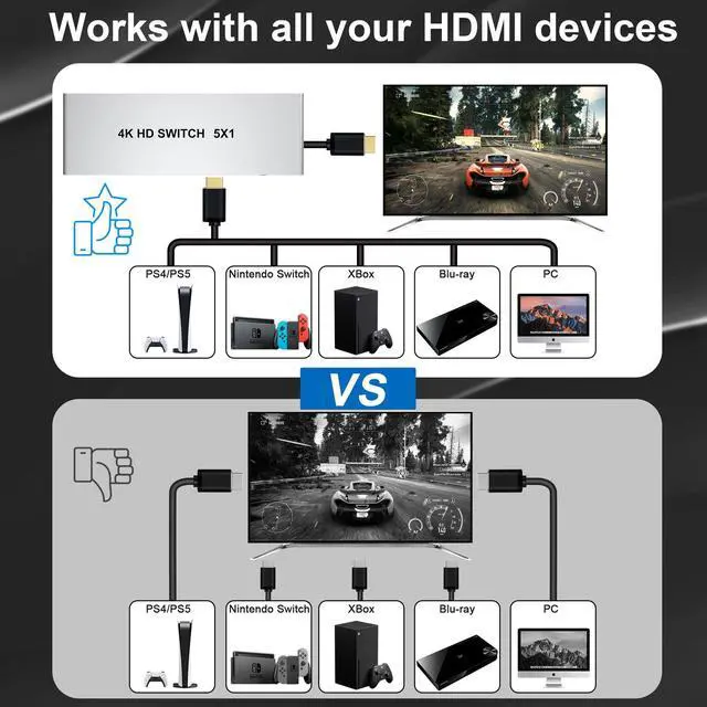 HDMI switch 5 In 1 Out Works with all HDMI integrated devices,and some Game devices or Some device with hdmi ports, such as PS3/PS4/PS5, Xbox, Roku, Blu-ray player, DVD, laptop, Fire TV Stick, etc; And connect 1 HDMI output display device, such as Ultra 4K TV (UHD TV), HDTV, monitor, display or projector,Backward compatible HDMI 1.4, 1.3 devices.