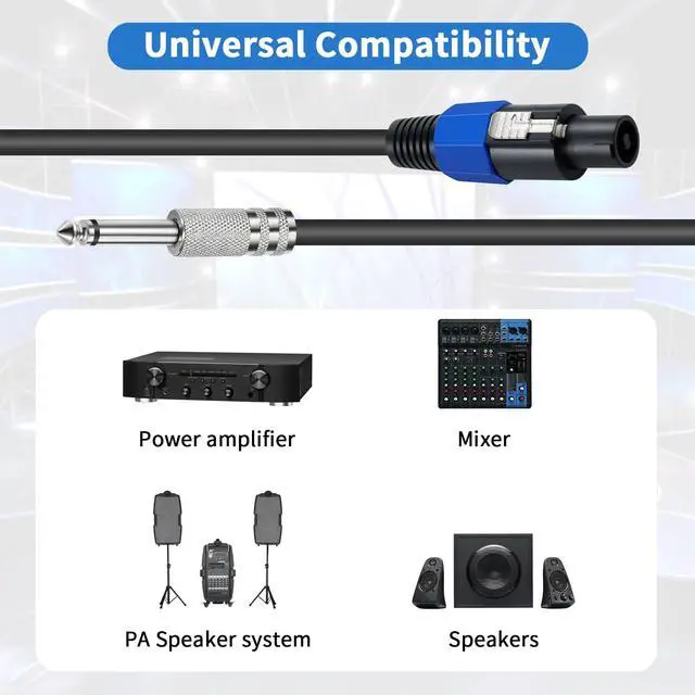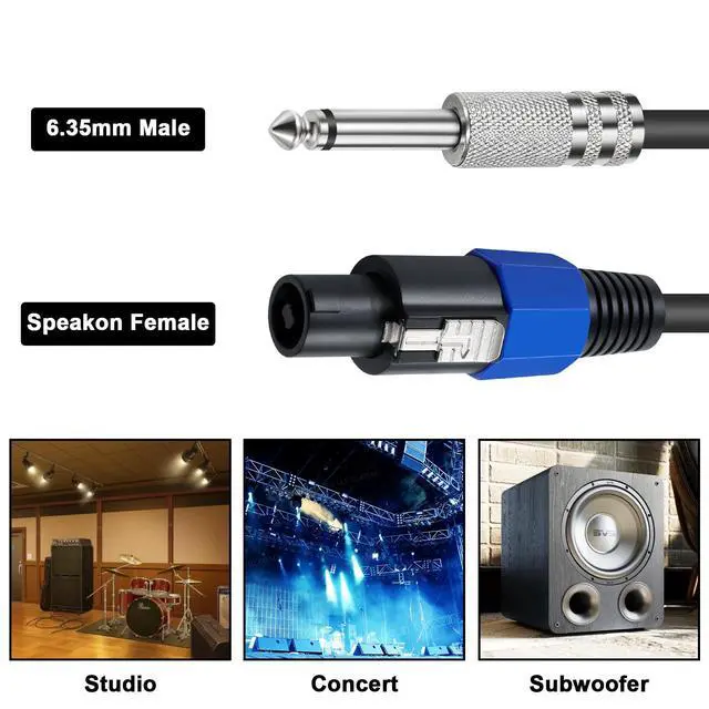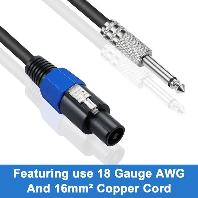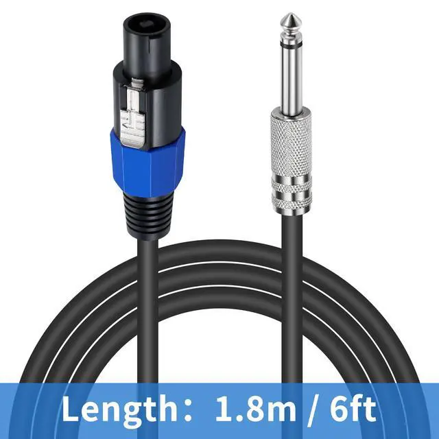 Speakon to 1/4 Speaker Cable Connector 1: Speakon Male plug Conenctor 2: (6.35mm)1/4 inch TS Male plug Nickle Plated. Cable Length: 6ft/1.8m. Speakon to 1/4 inch TS Cablemade of premium PVC-85P of cable outer material, and 6mm² of full copper wire material, which is soft lightweight and durable for a very long time, conduct quite well, environmental friendly.