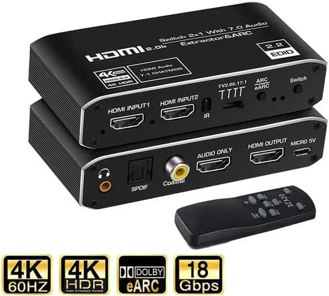 2x1 HDMI Switch With Audio Extractor: 4K HDMI 2.0 Audio Extractor at high performance. It has 2 HDMI Input and 1 HDMI output with audio Extract Function. Support ARC and eARC Function. The Extract Audio can be output by 3.5mm Audio Jack, Toslink SPDIF, Coaxial, HDMI Audio Port. It allows user to use the existing audio Receiver to receive 4Kx2K@60Hz, HDCP 2.3 content audio. The product also supports HDMI loop out, as well as 10bits HDR(High Dynamic Range).
