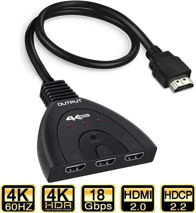 4K 60Hz HDMI Switch: HDMI switcher 3 ports can switch the video and audio of three different HDMI input source (TV Box,X box, Roku, etc.) to one HDMI displays (TV, Monitor, Projector, etc.) With a manual switch button on the top of the HDMI selector switcher box, you can easily switch between 3 HDMI sources without plug and unplug, which can protect all the devices. NOTE: This is HDMI Switch 3 input 1 output, NOT support 1 in 3 out!