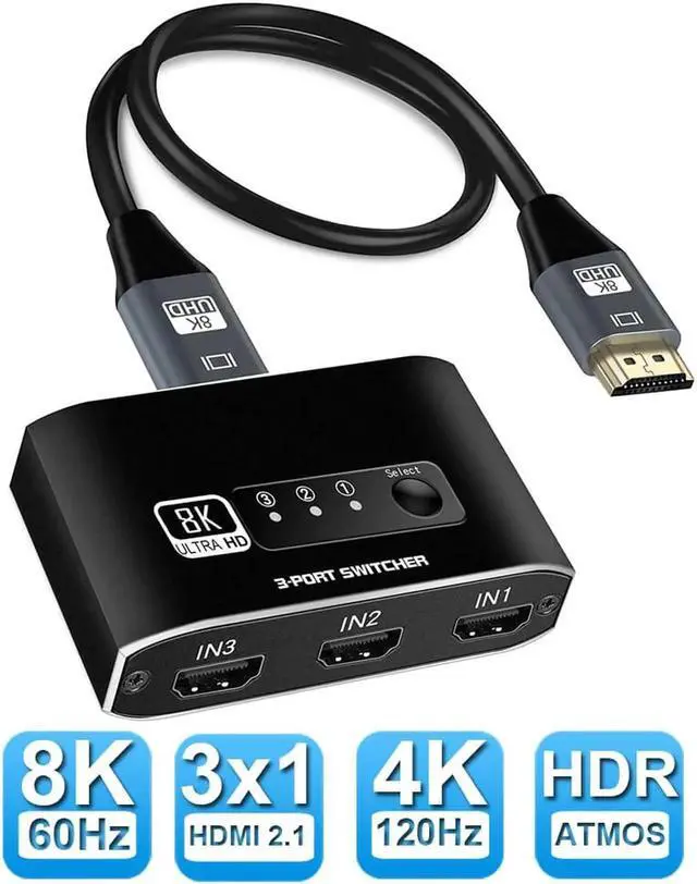 8K HDMI 2.1 Switch 3 x 1: high quality aluminum alloy HDMI 2.1 switch 3 in 1 out, connect 3 HDMI sources to one display to switch between different devices, reduce the mess of cable connection on your TV for seamless office-game switching, Enjoy playtime and work time with ease.