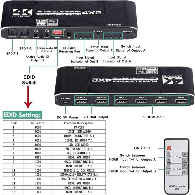 [4K 60Hz High Resolution] 4 inputs and 2 outputs HDMI matrix supports highest resolution up to 3840*2160 60Hz, also Ultra HD, 4K 30Hz, 2K@144Hz, 1440p, 1080p, 3D, RGB 4:4:4 and RGB 8:8:8. Data rate reaches 18.5Gbps and tmds clock up to 600Mhz. 4 in 2 out HDMI matrix supports 8/10/12/24/32/48bit deep color and HDCP 2.2, HDMI2.0b. Remember to set EDID correctly and embrace your stunning visual experience!
