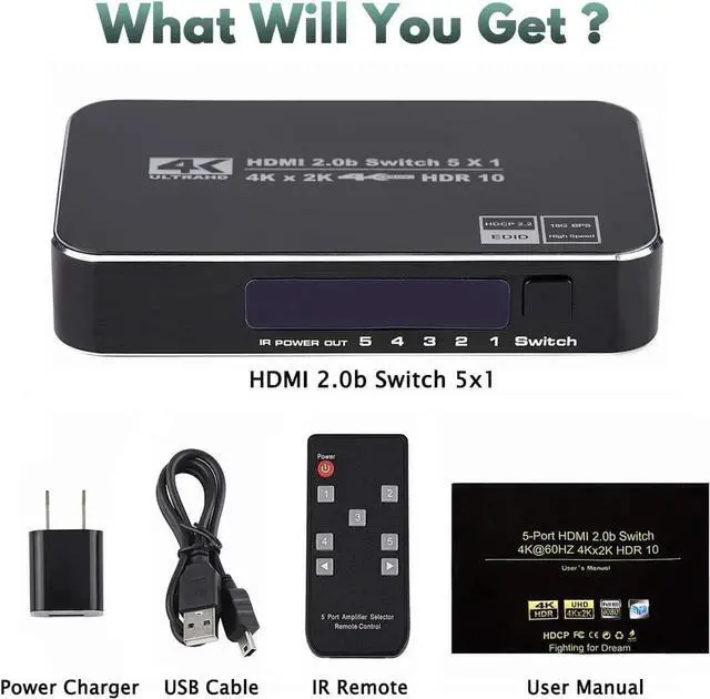 HDMI Switch 4K@60Hz, 5 Port HDMI 2.0 Switcher Selector 5 in 1 Out HDMI Switch with IR Remote Control, Supports 4K HDR10 HDCP 2.2 3D Dolby for Nintendo Switch,Xbox PS5/PS4,Fire Stick and More
