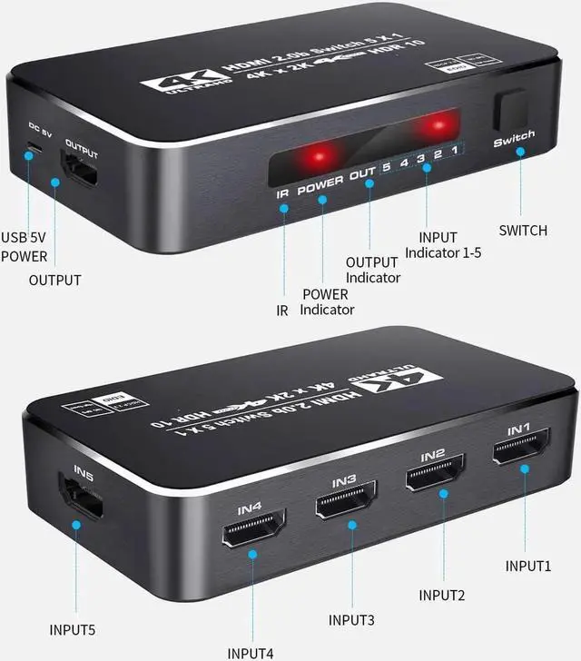 5 Input 1 Output HDMI Switch: Easily switch 5 HDMI sources to a single HDMI output by a local select button or IR remote control.