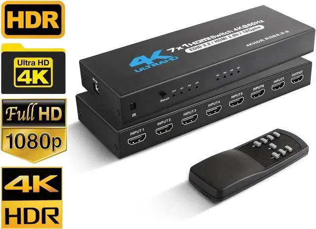 - [Remote, Automatic, and Manual Switching] Our 7 port HDMI switcher 4k 60Hz offers 3 switching modes. With a remote control that has a range of up to 26 feet, can effortlessly switch your display content without leaving your couch. The automatic switching logic detects new input sources and switches to them automatically. You can also use your console controller or media player remote for easy switching. Lastly, if you're using this device on a desktop, manual switching is also very convenient.