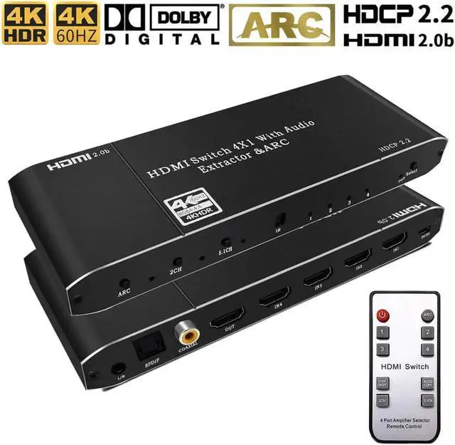 HDMI Switch with Audio Extractor 4K 60Hz Optical + 3.5mm AUX + Coaxial Output, HDMI Switcher 4 in 1 Out HDMI Audio Splitter Converter IR Remote Support ARC HDCP2.2 1080P 3D Dobly Atmos,EDID,HDR10
