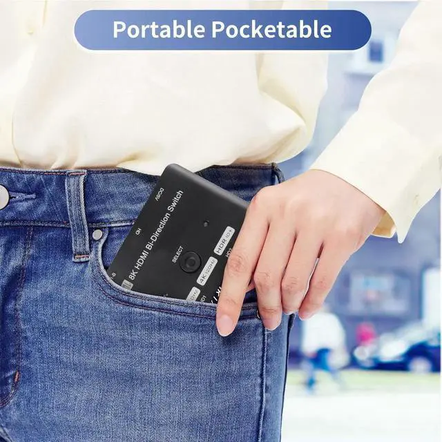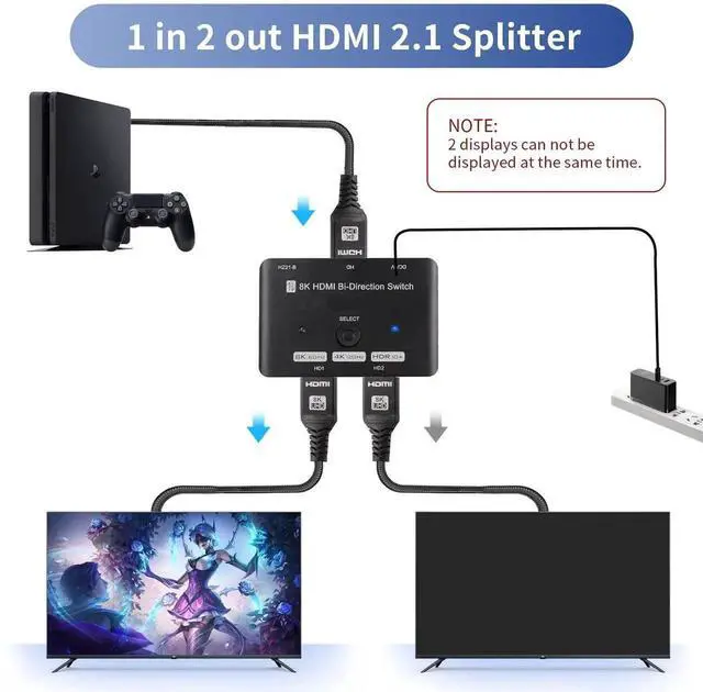 Upgraded HDMI 2.1 switch with new designed HZ21 chip is more stable than similar products in the market, supports bidirectional 2in 1out or 1in 2out(2out can not display simultaneously)