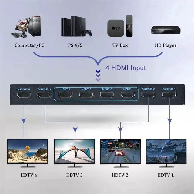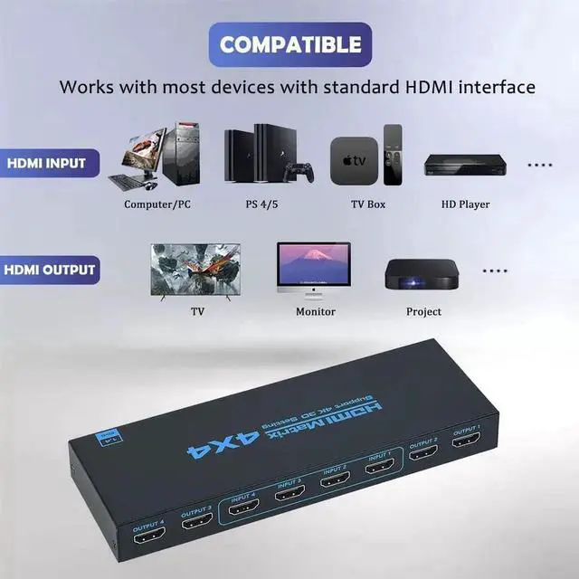 HDMI Matrix Switch 4x4: This HDMI Matrix Switch 4x4 can connect 4 HD signal sources to 4 HD display terminals not over YUV 4K@30Hz. The matrix allows 4 HDMI devices to be switched or split easily to 4 HDMI compatible monitors or projectors. It supports HDMI 1.4, 1080P@60Hz, 3D, YUV