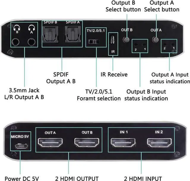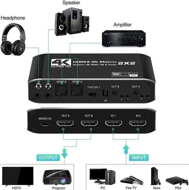 HDMI Matrix 2x2: HDMI Matrix Switch can connect two 4K HDR signal sources to two HD display or monitor, and it can also extract the HDMI input Audio signal with Toslink SPDIF optical fiber or 3.5mm stereo headphone output. It can also control by a IR remote control.