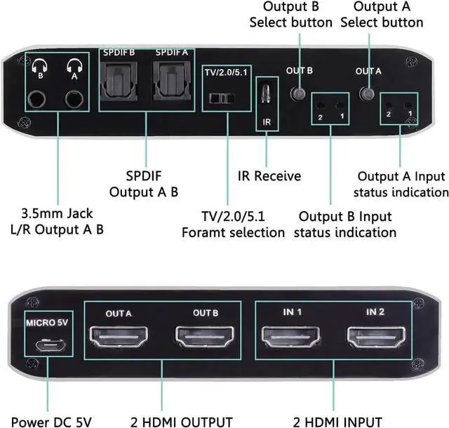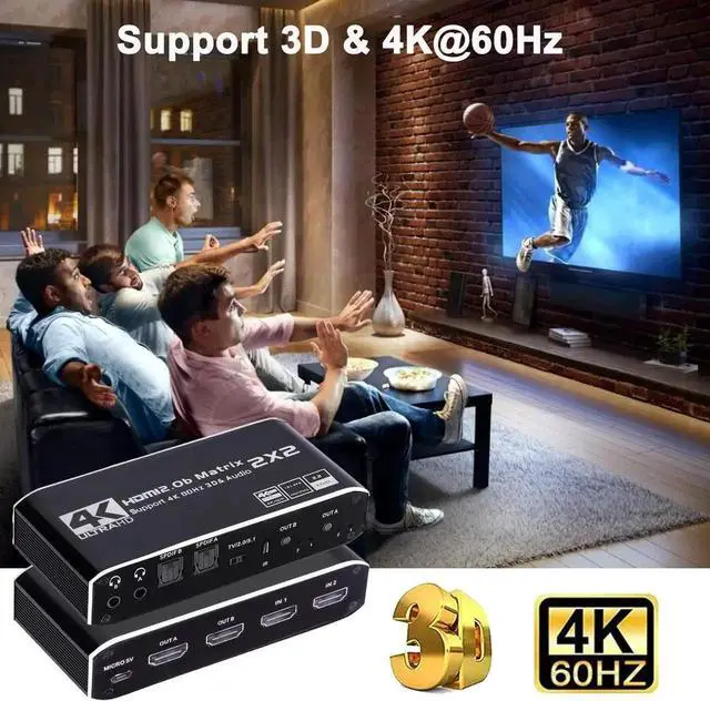 HDMI Matrix 2x2: HDMI Matrix Switch can connect two 4K HDR signal sources to two HD display or monitor, and it can also extract the HDMI input Audio signal with Toslink SPDIF optical fiber or 3.5mm stereo headphone output. It can also control by a IR remote control.