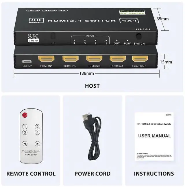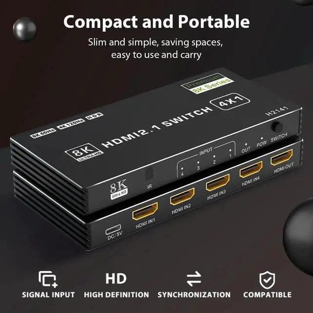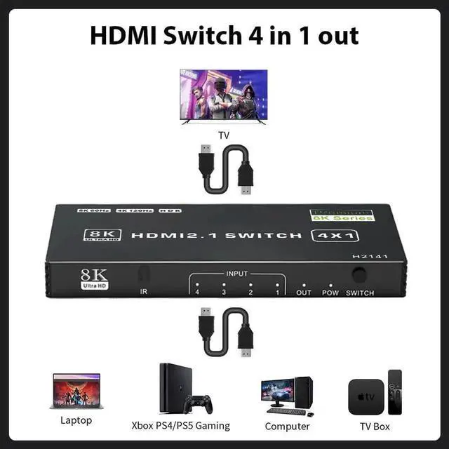 4 Port 8K HDMI Switch: Vszerda 4 In 1 Out HDMI Switch allows 4 input signals to 1 monitor display, effortlessly switch to your TV with only one HDMI ouput port. Solving your multiple HDMI devices issue