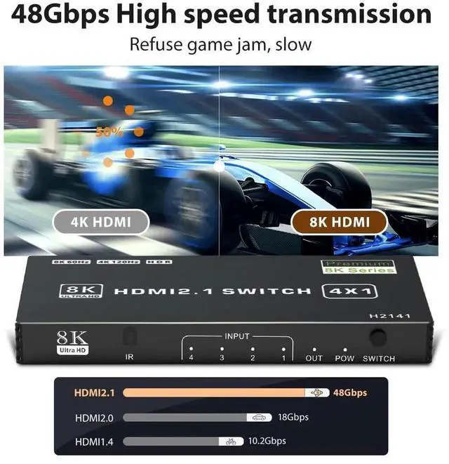 8K Ultra-HD: The HDMI 2.1 switcher supports up to 8K@60Hz (or 4K@120Hz, 2K@144Hz, 1080P@240Hz). It features HDMI 2.1, HDCP 2.3, Dolby Vision, HDR10, RGB 8:8:8 color display. And with 48 Gbps video bandwidth, which brings you the stunning immersive visual game experience