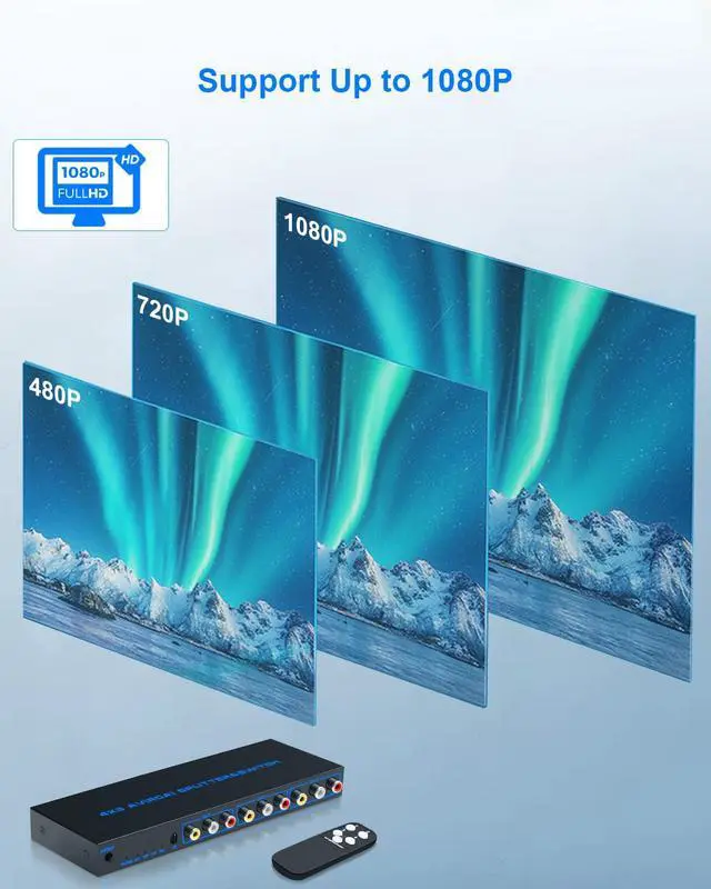 [1080P High Resolution]4-way Av splitter distributor supports up to 1080p Resolution, enabling you to get sharp, clear visual images and reliable audio even in a long-distance connection.