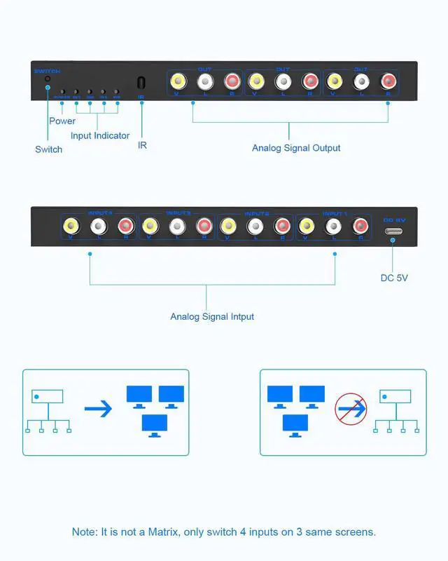 [4-way RCA composite video splitter]4 port RCA Switch Box splits 4 audio video analog signals into 3 TV monitors /projectors for multiple viewing monitors or dubbing projects. Note: Each display will show the same picture, just mirror or duplicate the input source, not support extend, not matrix.