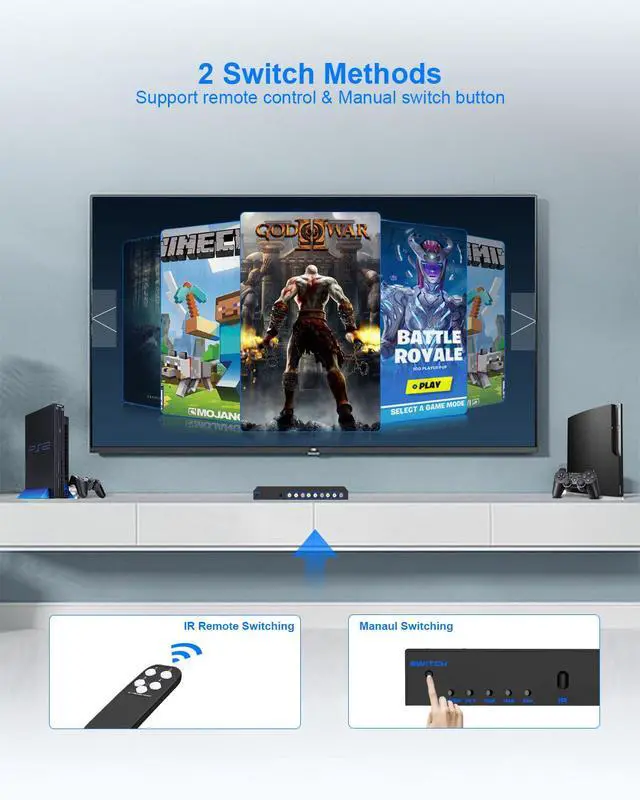 [Manual Switch & Remote Control] RCA switcher 4 input 3 output with sturdy metal casing, anti-skid feet ensuring rapid heat dissipation for protection and longer use life. It can switch manually and also allows you to select input sources through an IR remote controller without having to get up from your seat.