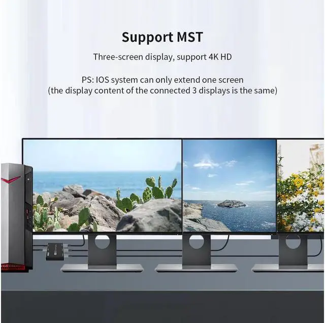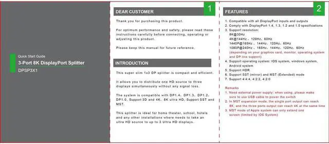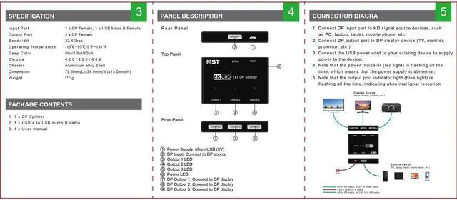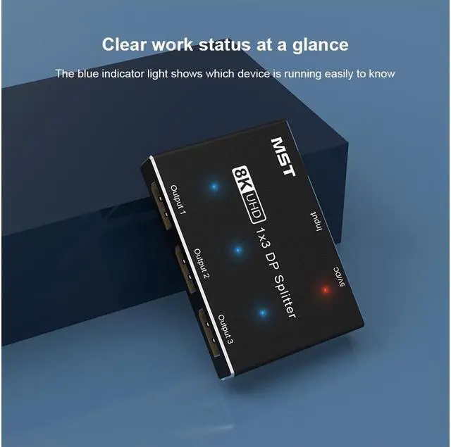 DisplayPort Splitter: Split one DP signal into 3 signals. Supports output of 3 same screens in mirror mode or 3 different screens in MST mode. In MST expansion mode, the single port output can reach 8K@30Hz 4K@144Hz, and the three ports output can reach 4K@60Hz at the same time. MST mode of Apple system can only extend one screen (limited by iOS System). when using, please make sure to use USB cable to power the Splitter switcher.
