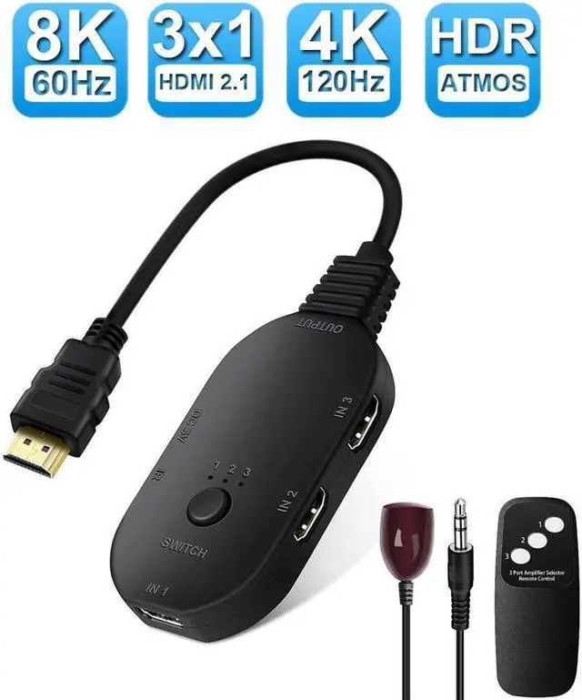 Control at Your Fingertips: This 8K HDMI 2.1 switch comes with an IR remote control and a switch button. Easily switch HDMI interfaces from your couch or bed within a range of 15ft. (Note: The switching time is about 1-2 seconds. )
