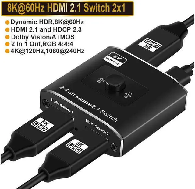 8K@60Hz/4K@120Hz HDMI Splitter, Switcher 2 in 1 Out --- Premium Aluminum alloy HDMI switch 2x1 easily streams video and audio from 2 different HDMI sources to 1 HDMI display, No lag, NO flash or drop in resolution. Release you from the plugging and unplugging HDMI cables, easily enjoy work time and playtime via switching between 2 devices with one button.
