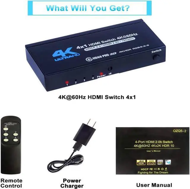 [4 Input 1 Output 2.0 Switch] HDMI 4 in 1 Switch connects up to 4 HDMI source components to one HD Display, solving your multiple HDMI devices issue. Seamlessly switch between games, TV, desktop, creating a superb picture quality and seamless sound. NO lag, NO flash or drop in resolution.