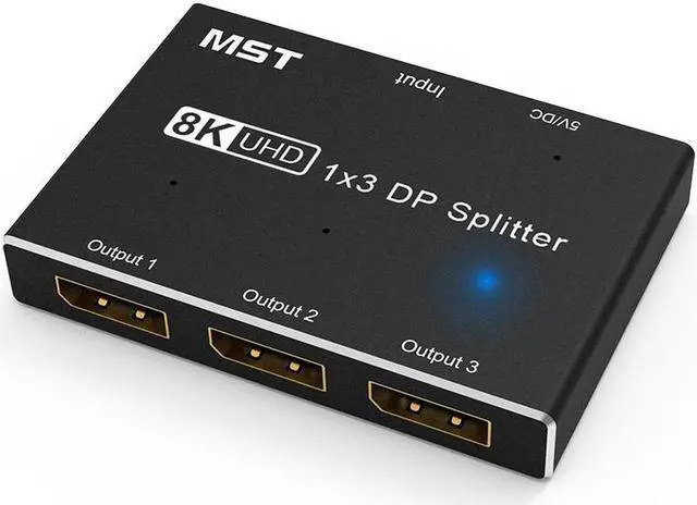 NEW 1x3 DisplayPort Splitter: Split one DP signal into 3 signals. Supports output of 3 same screens in mirror mode or 3 different screens in MST mode. In MST expansion mode, the single port output can reach 8K@30Hz 4K@144Hz, and the three ports output can reach 4K@60Hz at the same time. MST mode of Apple system can only extend one screen (limited by iOS System). when using, please make sure to use USB cable to power the Splitter switcher.