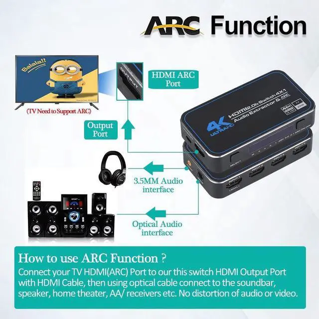 This HDMI switch supports HDR (4:2:0 YUV Format) 12-bit deep color, HDCP1.4, HDMI 2.0 (YUV 4:2:0), can easily select 4 HDMI sources that scale up to 4K@60Hz to a single HDMI output which your want to output.The HDMI Switcher support 12bit per channel(48bit all channels) Deep Color, Support ARC function. The HDMI Output can be selected by a local button or an IR wireless remote control.