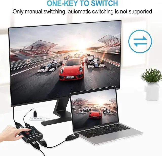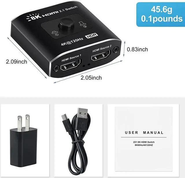 Directional HDMI 2.1 Switch 2 Input 1 Output: Premium Aluminum alloy HDMI switch 2x1 easily streams video and audio from 2 different HDMI sources to 1 HDMI display, NO lag, NO flash or drop in resolution. Release you from the plugging and unplugging HDMI cables, easily enjoy work time and playtime via switching between 2 devices with one button.