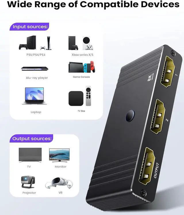 BI-Directional HDMI 2.1 Switch Splitter: Connect two HDMI sources to one monitor (as a switcher) or toggle between two monitors with one source (as a splitter, one screen at a time). Effortlessly switch with a button push. Simplify and enhance your multimedia setup