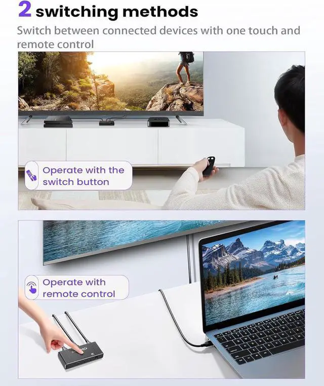 Plug and Play: Not Setup, No App, No external drive needed - simply press the button on the HDMI switcher to select your desired source or screen. Note: HDMI Cable NOT included.
