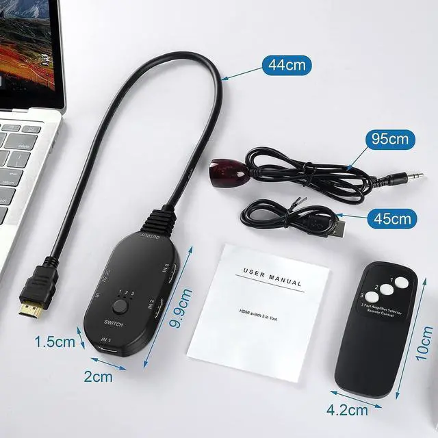 HDMI Switch 3 in 1 out: HDMI Switch 4K 120HZ allows you to connect 3 HDMI input sources into to 1 HDMI output display. Easy to toggle between HDMI sources by a push of a switch button or a remote. No need to plug and unplug the cables.Immersively enjoy your working and video time and save your time!