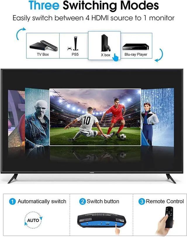 This HDMI Switch 4x1 with audio extractor can connect up to 4 HD Source to 1 HDMI Display, and extracts audio from the 4K HDMI signal to HDMI 7.1 atmos audio, optical fiber or stereo audio and send it to an external speaker or soundbar.