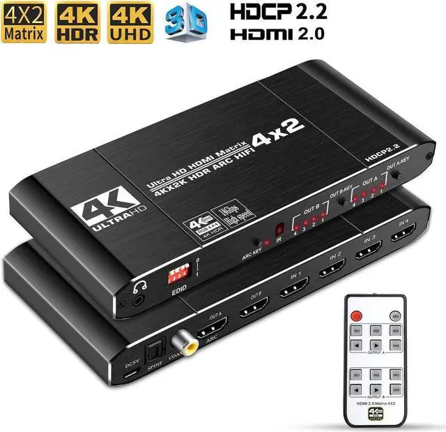 HDMI 2.0 Matrix Switcher Splitter 4x2 4K@60Hz HDR UHD 18Gbps ARC Audio Extractor SPDIF Coaxial 3.5 mm Audio EDID Setting HDCP 2.2