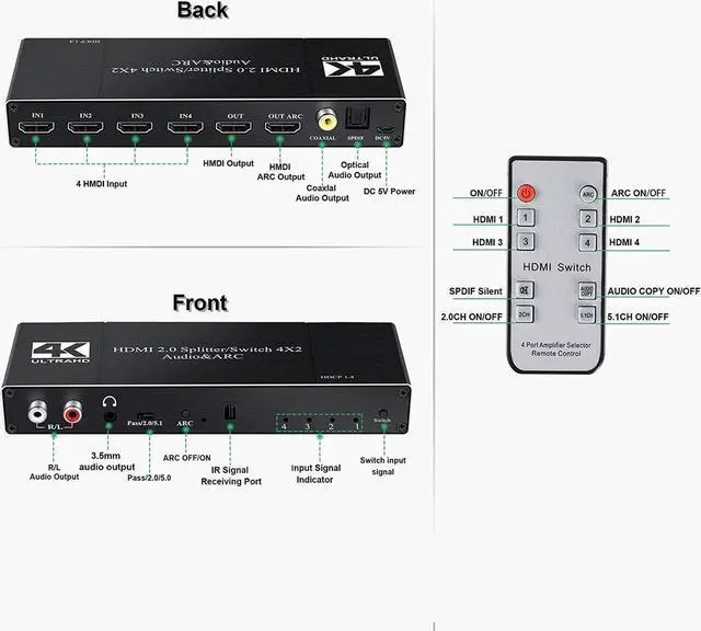 4K HDMI Switch Splitter,4 in 2 Out HDMI Switch Splitter Support ARC with R/L 3.5mm Audio + Coaxial + SPDIF Audio Extractor Function with IR Remote Control