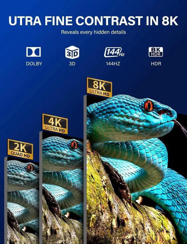 8K Ultra HD Resolution: Supports resolutions of 8K@60Hz, 4K@120Hz, 1080P@240Hz, provides you with a transmission rate of up to 48Gbps and is backward compatible with all previous HDMI standards. Tips: If you need to output 8K@60Hz and 4K@120Hz, we recommended using a High-quality HDMI 2.1 standard cable, Share the most luxurious video & audio.