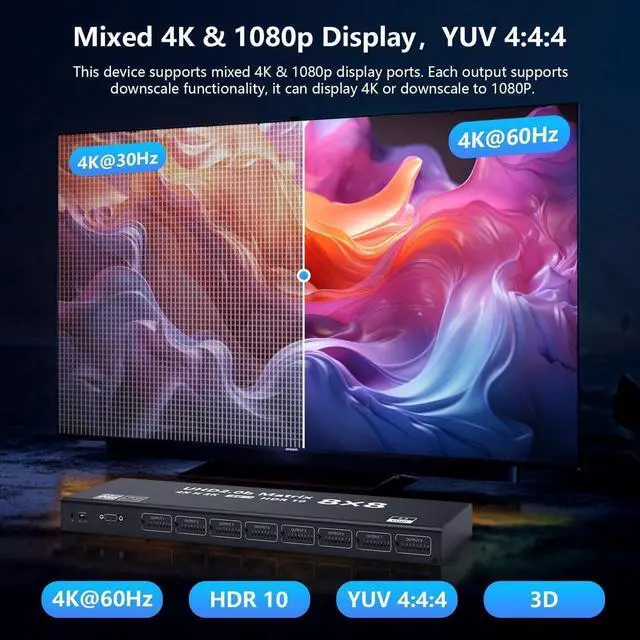 Support 4K HD:This HDMI Matrix 8×8 Input resolution supports 4K@60Hz/4K@30HZ/1080P and is backward compatible. Provide excellent video quality, support 3D stereo imaging technology, 4K HD transmission, clearer and more detailed colors, lifelike picture quality.