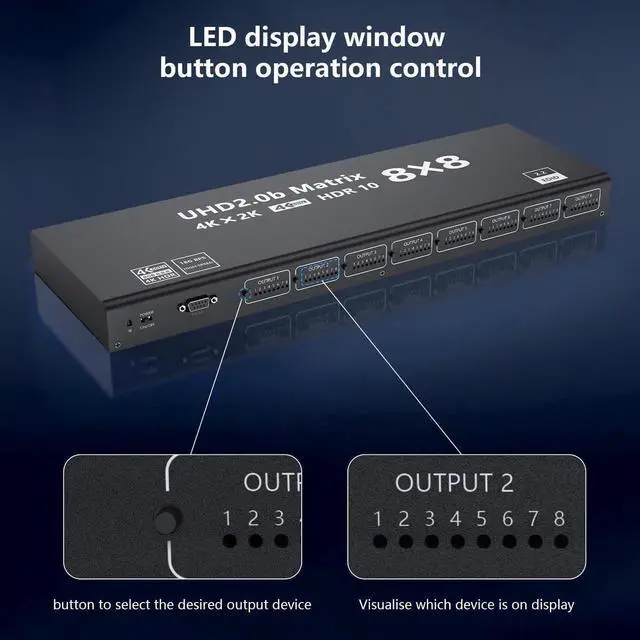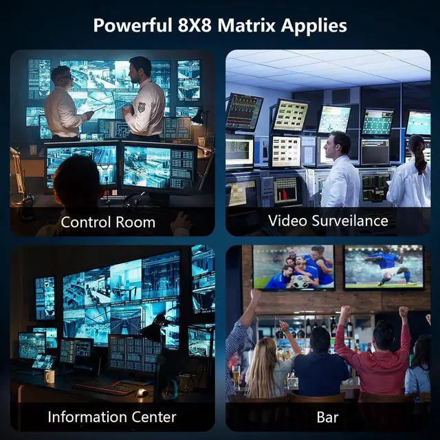 4K HDMI Matrix 8 in 8 out: The HDMI Matrix 8x8 can connect 8 HD signal sources to 8 HD display terminals. The matrix allows 8 HDMI devices to be switched or split easily to 8 HDMI compatible monitors or projectors. Our device offers solutions for noise, space and security concerns, data enter control, information distribution, conference room presentation, school and corporate training environments.