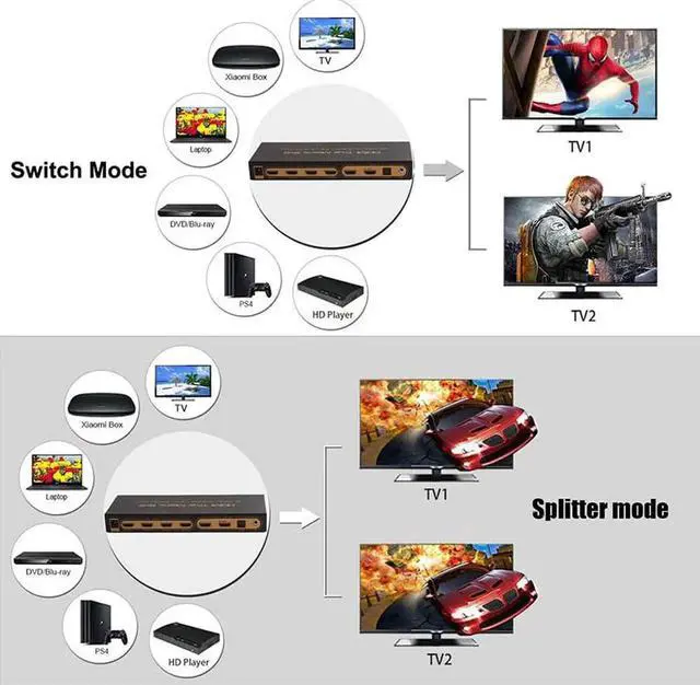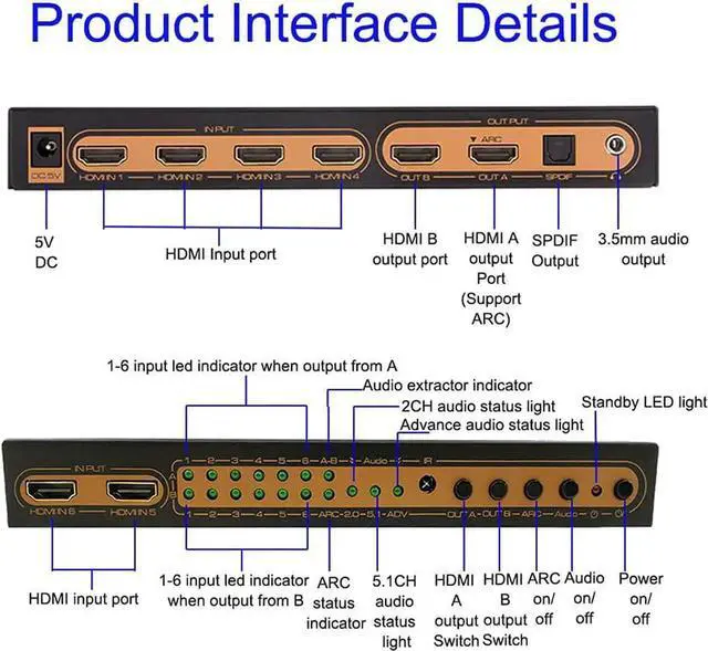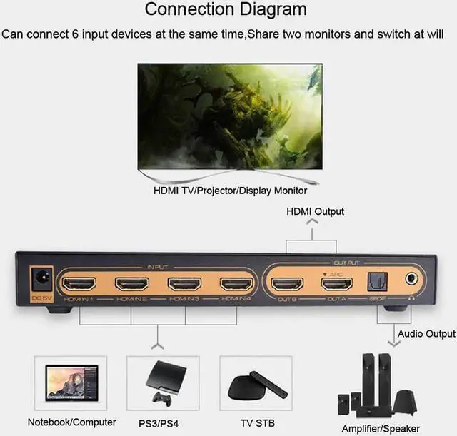 Productfeatures: *Six HDMI signal input switch or assign to two HDMI display devices *HDMI resolution supports up to 4kx2K@30HZ, 1080P/60HZ, and 3D *Any signal terminal can achieve independent audio output through optical fiber or stereo 3.5 headphones *It can realize audio synchronization and separate output, and there are three audio modes of 2.0, 5.1, ADV to choose from *Support ARC function, output TV ARC return audio through optical port (only OUT A supports ARC function). *Support HDMI audio separation, can output SPIDF digital audio and earphone analog audio *SPDIF digital audio output supports Dolby digital (AC3), DTS supports 5.1 channels *Support