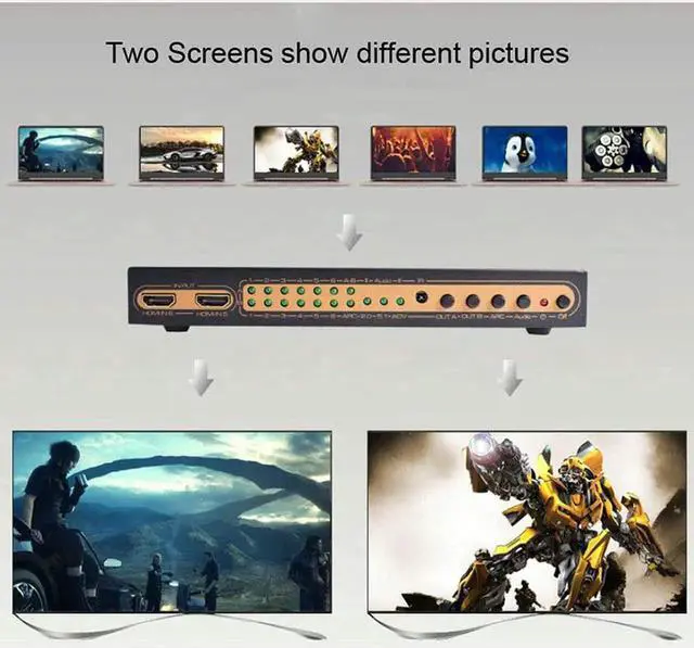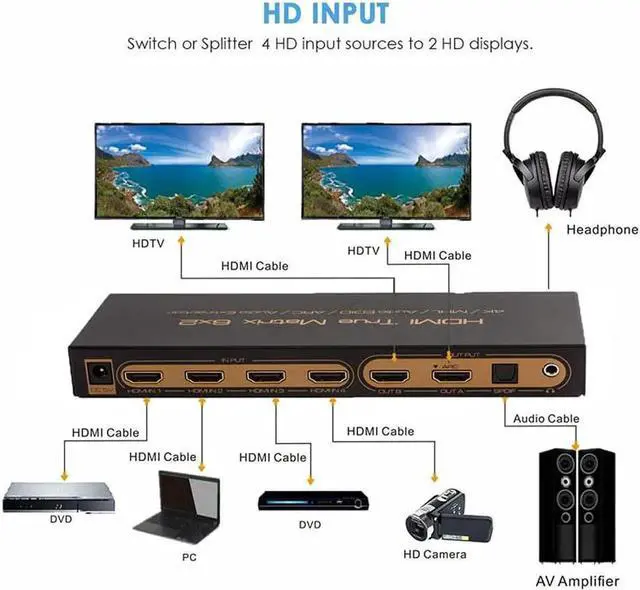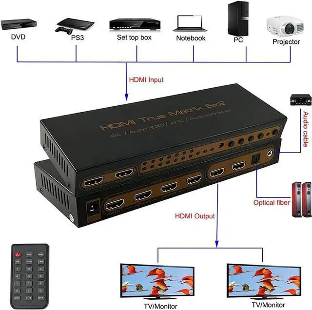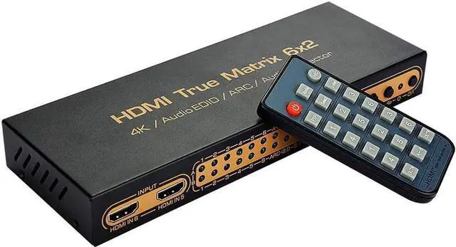 This is a HDMI matrix that supports PIP, ARC, 4K, 3D, six inputs and two outputs. Six high-definition signal sources can be connected to two HDMI high-definition display devices at the same time. It can easily switch or distribute six high-definition signals on two displays or projectors compatible with high-definition signals, and any signal source can be used. The independent audio output is realized through optical fiber or stereo earphone. It also supports the ARC function. When the high-definition TV directly receives audio and video content, the high-definition TV directly transmits the audio to the A/V amplifier receiver through the HDMI cable.
