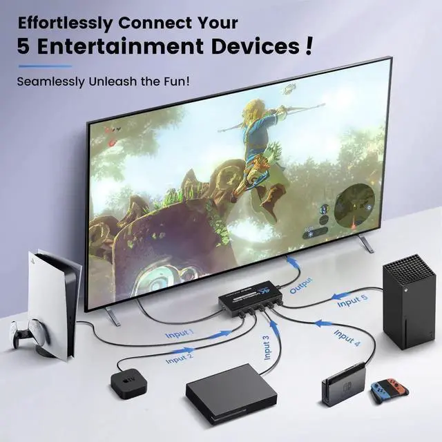 5-Port HDMI Switcher for Seamless Connectivity Eliminate cable clutter with this advanced HDMI switcher that effortlessly connects up to 5 devices to a single display. Enjoy stunning 4K UHD resolution at 60Hz with HDR support and immersive audio for a true cinematic experience. The high-speed 18Gbps transmission ensures smooth, lag-free performance for gaming and movie watching. Control your devices with three convenient options: remote control (up to 26ft range), automatic input detection, or manual selection. Compatible with most gaming systems, streaming devices, and media players, this complete set includes the switcher, remote, power adapter, Type-C cable, and user manual for quick setup.