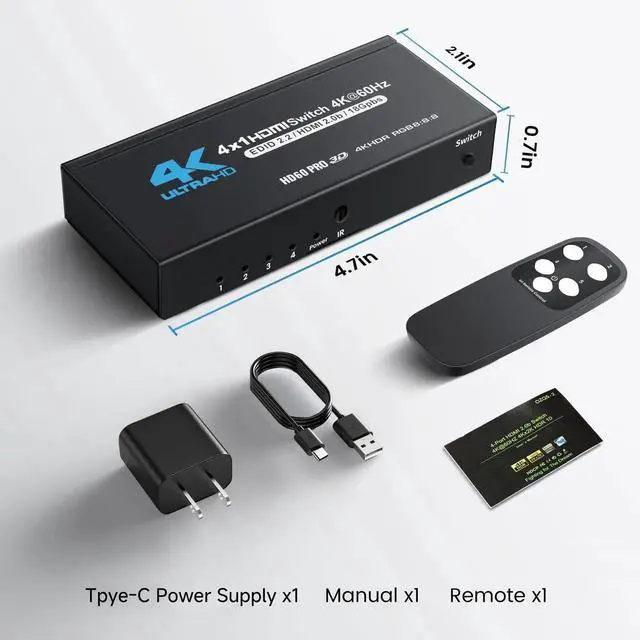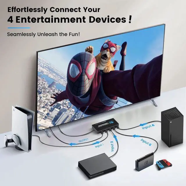 - [Flexible Switching Options] Choose from three convenient switching methods.Remote control (26 ft range) for effortless input changes from your couch.Auto-switching detects active devices for instant playback.Manual switching for direct control when preferred.