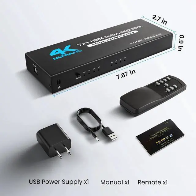 The 3D, 4K*2K 60Hz.2.0b HDMI signal switch supports 7 HDMI signal inputs and one signal output, making HDTV images more perfect; and supports the synchronous output of a 32-bit number and analog sound, enabling the switch between any signal sources through buttons and remote controls. The HDMI splitter 7 in 1 out has a fashionable and elegant appearance and is easy to operate. The excellent quality allows you to experience the fun brought by the infusion of science and technology into life.
