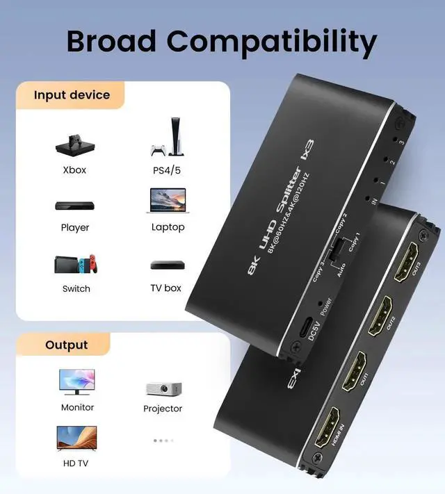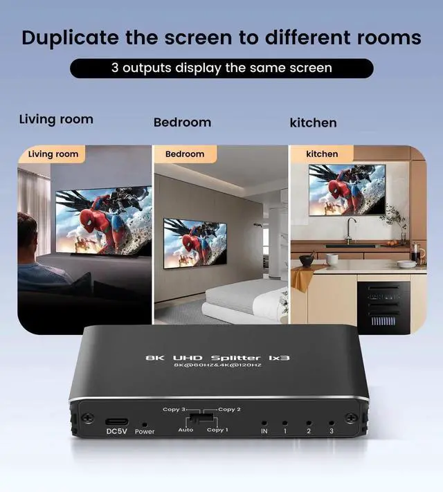 8K@60Hz 1 in 3 out HDMI Splitter, duplicate video and audio without any loss or delay.