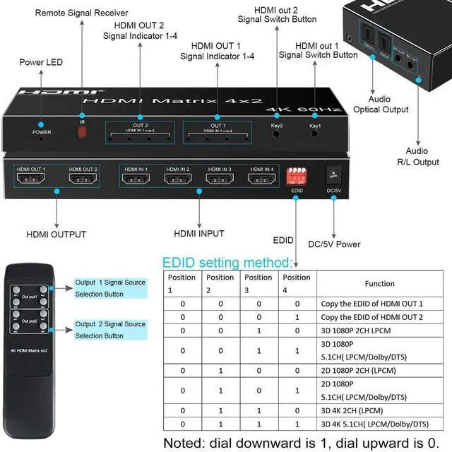 Additional Features- [Audio Extract]Audio format support LPCM/DTS5.1 channel/Dol-by-AC3 and smart EDID management. You could set the EDID as user guide to adjust the resolution and audio format. Any input high-definition source can extract audio separately or at the same time by SPDIF or 3.5mm audio output port. The built-in infrared sensor is equipped with a convenient and intuitive remote control. You can switch the input source by the remote control or by pressing the manual button.