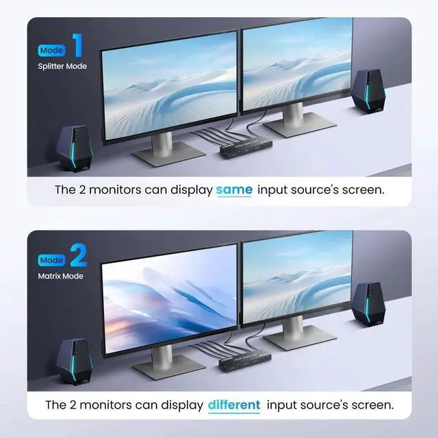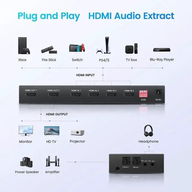 - [Widely Compatible]This 4K@60Hz 4X2 HDMI matrix contains built-in automatic equalization and amplification functions to ensure the best transmission without loss of video/audio quality. Widely compatible with most devices. Input port can connect HDMI source devices like VCD/DVD player, Blu ray players, Xbox, ROKU, STB/fire TV, Amazon Fire stick box, PS3, PS5, PC and etc. Out port can connect monitor, projector, HDTV and more.