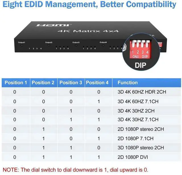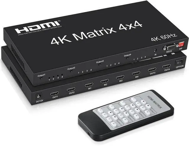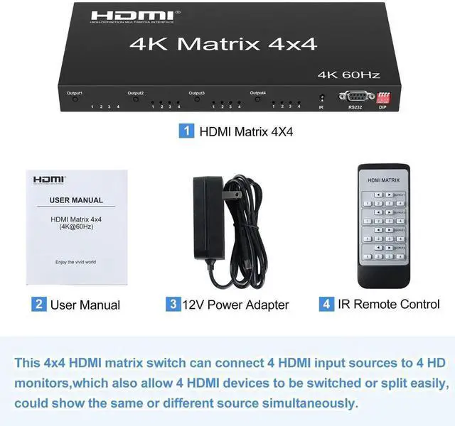 This HDMI matrix 4x4 switcher can connect 4 HD signal sources to 4 HD displays, which allows 4 HDMI devices to be switched or split easily to 4 HDMI compatible monitors or projectors.