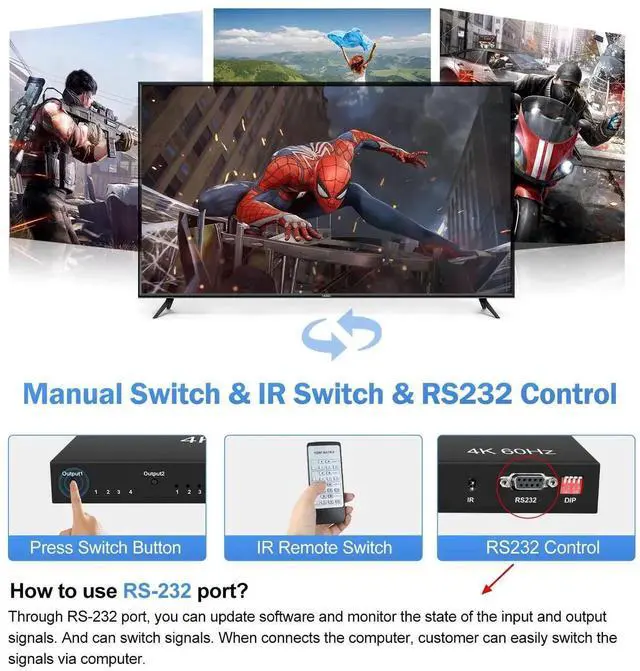 Through RS 232 port you can update software and monitor the state of the input and output signals. And can switch signals. When connects the computer, customer can easily switch the signals via computer.