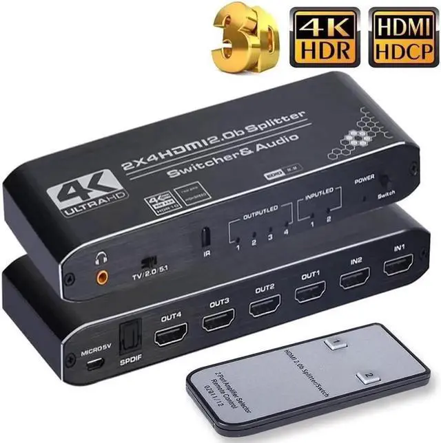 - 2 HDMI inputs switch and split to 4 HDMI displays