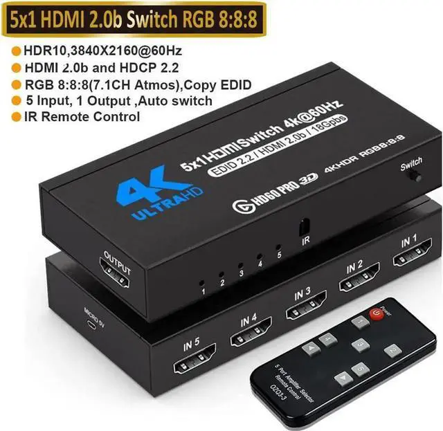 [5 Input 1 Output 2.0 Switch] HDMI 5 in 1 Switch connects up to 5 HDMI source components to one HD Display, solving your multiple HDMI devices issue. Seamlessly switch between games, TV, desktop, creating a superb picture quality and seamless sound. NO lag, NO flash or drop in resolution.